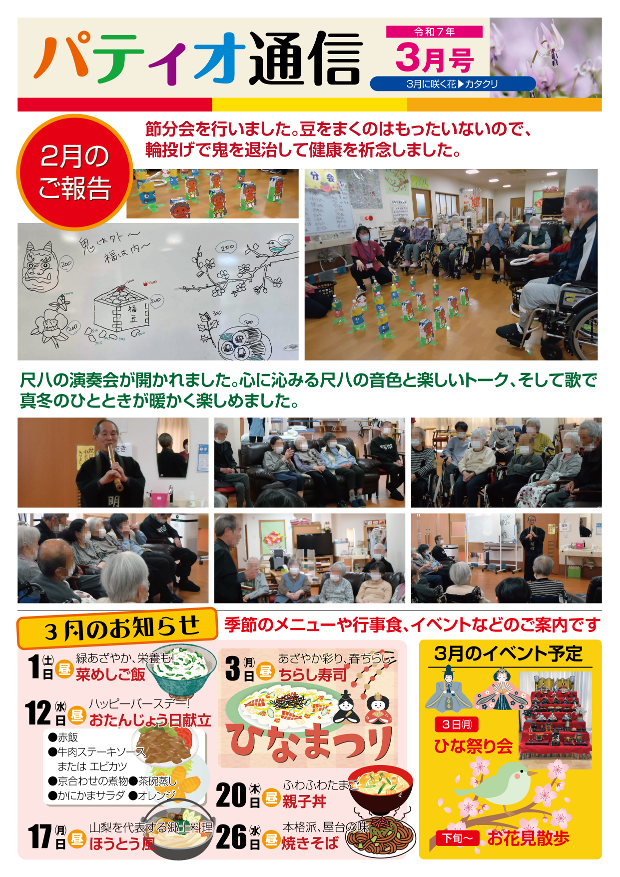「パティオ通信」令和7年3月号 2025年03月10日 「パティオ通信」令和7年3月号を発行しました。 前のページ へ 次のページへ ページトップへ トップぺージ ◆「健」- 看護と介護 - ◆「動」- 機能の回復 - ◆「食」- 健康を維持 - ◆「こだわり」 入居費用の案内 ご入居までの流れ 施設の紹介 お楽しみ 併設施設 パティオ通信 アクセス リクルート ボランティアさん募集 お問い合わせ 〒471-0855 愛知県豊田市柿本町4丁目8番地 ●お問い合わせ・資料請求は TEL.0565-71-1165FAX.0565-71-1167 [併設施設] ○通所リハビリテーション ハートフルデイケア 0565-71-3871 ○訪問介護ステーション ラルガパティオ 0565-71-3873 ○眼科 柿本クリニック 0565-71-1212
