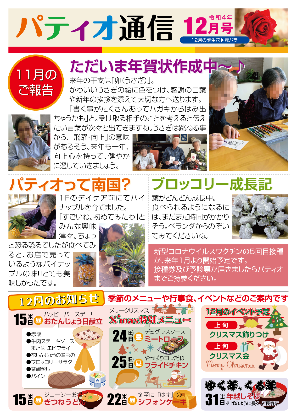「パティオ通信」令和4年12月号 2022年12月02日 「パティオ通信」令和4年12月号を発行しました。 前のページ へ 次のページへ ページトップへ トップぺージ ◆「健」- 看護と介護 - ◆「動」- 機能の回復 - ◆「食」- 健康を維持 - ◆「こだわり」 入居費用の案内 ご入居までの流れ 施設の紹介 お楽しみ 併設施設 パティオ通信 アクセス リクルート ボランティアさん募集 お問い合わせ 〒471-0855 愛知県豊田市柿本町4丁目8番地 ●お問い合わせ・資料請求は TEL.0565-71-1165FAX.0565-71-1167 [併設施設] ○通所リハビリテーション ハートフルデイケア 0565-71-3871 ○訪問介護ステーション ラルガパティオ 0565-71-3873 ○眼科 柿本クリニック 0565-71-1212