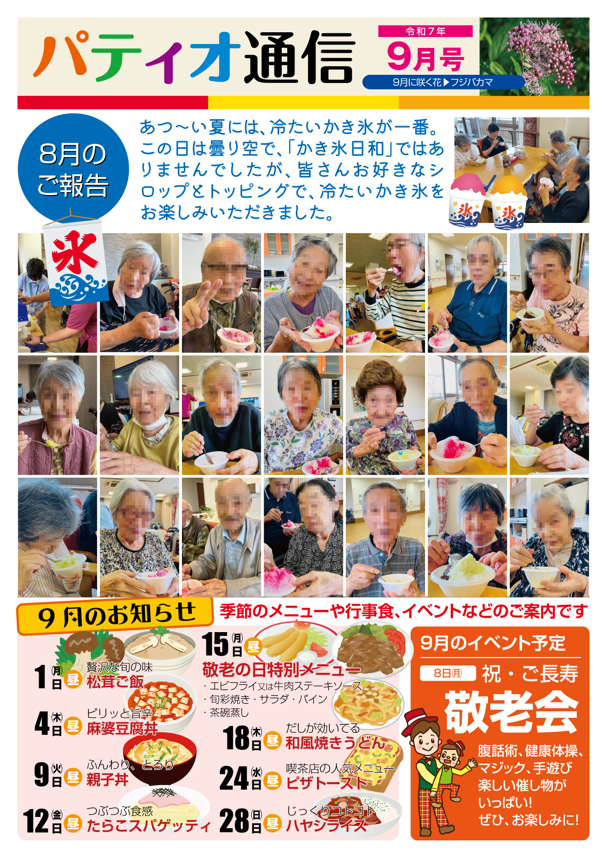 「パティオ通信」令和7年9月号 2025年09月02日 「パティオ通信」令和7年9月号を発行しました。 前のページ へ 次のページへ ページトップへ トップぺージ ◆「健」- 看護と介護 - ◆「動」- 機能の回復 - ◆「食」- 健康を維持 - ◆「こだわり」 入居費用の案内 ご入居までの流れ 施設の紹介 お楽しみ 併設施設 パティオ通信 アクセス リクルート ボランティアさん募集 お問い合わせ 〒471-0855 愛知県豊田市柿本町4丁目8番地 ●お問い合わせ・資料請求は TEL.0565-71-1165FAX.0565-71-1167 [併設施設] ○通所リハビリテーション ハートフルデイケア 0565-71-3871 ○訪問介護ステーション ラルガパティオ 0565-71-3873 ○眼科 柿本クリニック 0565-71-1212