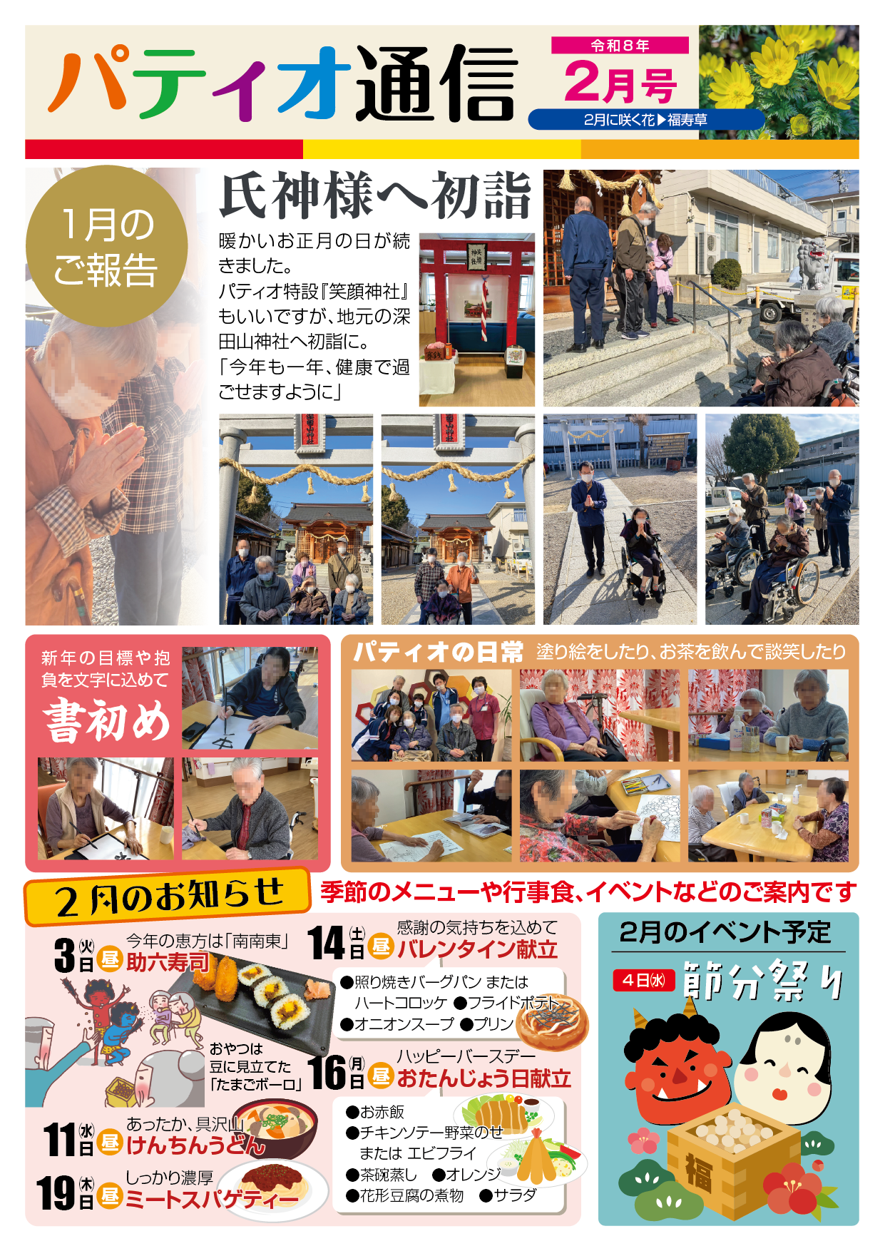 「パティオ通信」令和8年2月号 2026年02月02日 「パティオ通信」令和8年2月号を発行しました。 前のページ へ 次のページへ ページトップへ トップぺージ ◆「健」- 看護と介護 - ◆「動」- 機能の回復 - ◆「食」- 健康を維持 - ◆「こだわり」 入居費用の案内 ご入居までの流れ 施設の紹介 お楽しみ 併設施設 パティオ通信 アクセス リクルート ボランティアさん募集 お問い合わせ 〒471-0855 愛知県豊田市柿本町4丁目8番地 ●お問い合わせ・資料請求は TEL.0565-71-1165FAX.0565-71-1167 [併設施設] ○通所リハビリテーション ハートフルデイケア 0565-71-3871 ○訪問介護ステーション ラルガパティオ 0565-71-3873 ○眼科 柿本クリニック 0565-71-1212